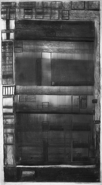 Carvão sobre papel de fibra de bambu e colagem de tecido bordado (s/data) pela falecida mãe aos 52 anos, em 1976